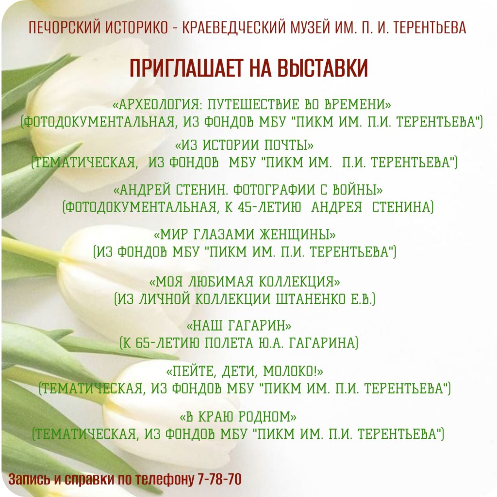 04.03.202605.03.2026МЕРОПРИЯТИЯ И ВЫСТАВКИ ВЕСНОЙ 2026 Г. Печорский историко-краеведческий музей им. П.И. Терентьева приглашает посетить мероприятия и выставки этой весной. Справки и запись по телефону: 7-78-70